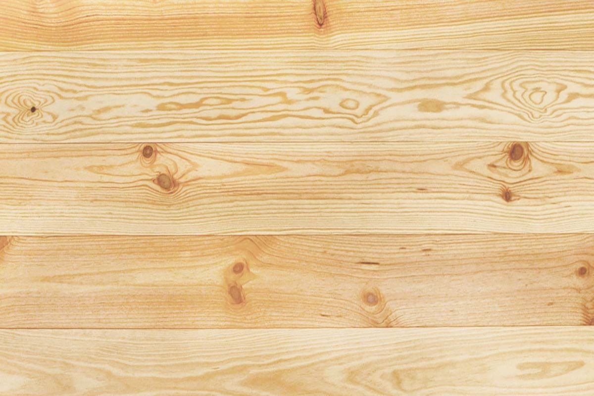 大きな節と黄白色と赤みを帯びた色調が特徴です。耐久性が高く、またパイン材の中では硬く傷が付きにくいため、住宅や商業施設などで多く用いられています。