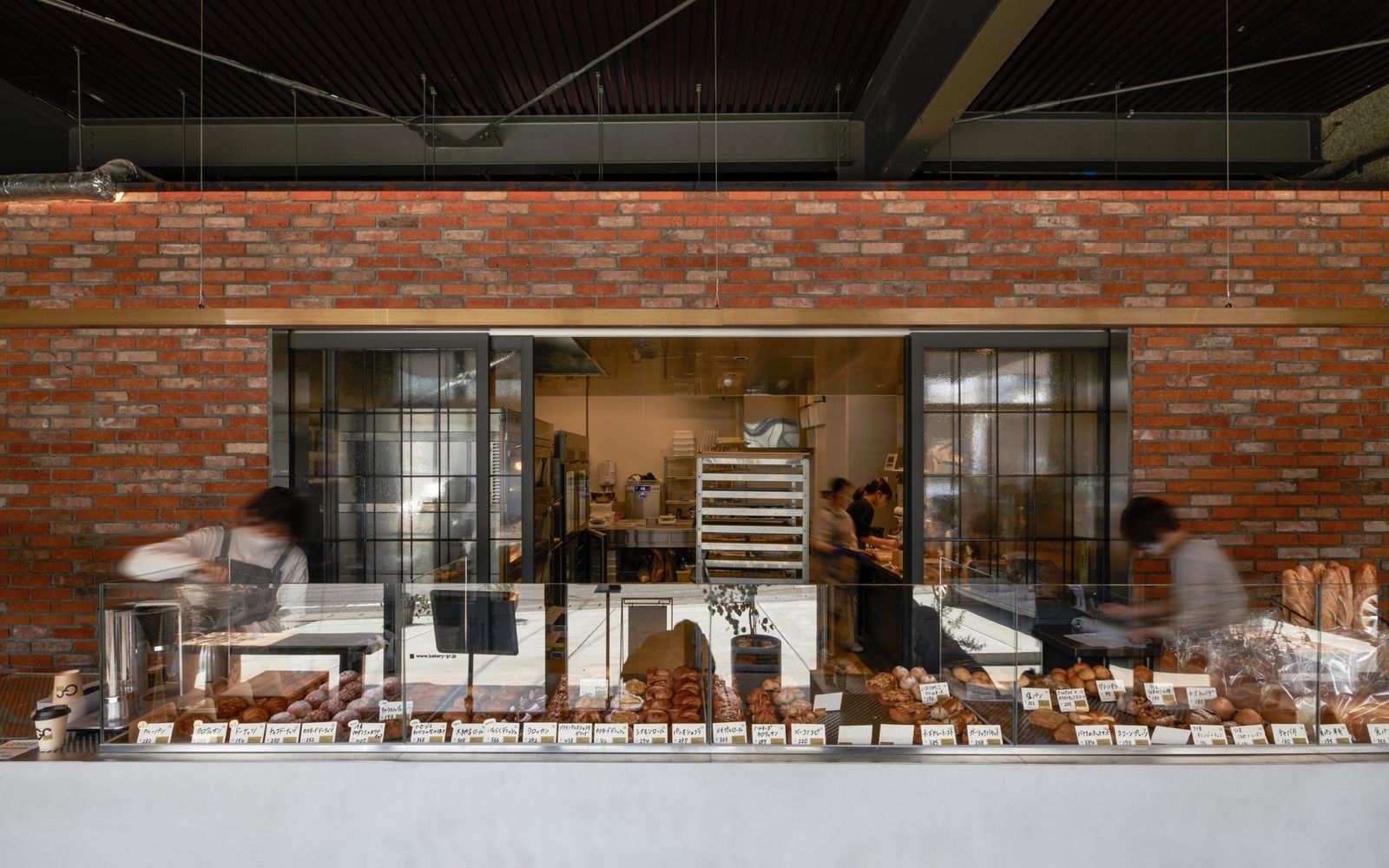 空間とパンが織りなす風景 仙台市内の小さなパン屋が、成長に伴い新しい店舗に移転するプロジェクトである。本計画では、単なる売場の拡張にとどまらず、パンの魅力や製造過程を可視化し、街路との対話を重視した空間構成を試みた。「黄金比」を意識した寸法や比率を織り込み、パン屋という商業施設でありながら、美的な空間体験を提供することを目的としている。 入れ子状のハコによるゾーニング 広大な倉庫のような既存空間の中央に、「入れ子状のハコ」を配置することで、売場・作業場・厨房の三つのパートに明確に分けた。売場は来店者に開かれ、厨房は作業の舞台として機能し、双方の間に適度な距離と視覚的つながりを保つ。 床のコンクリート削り出しや天井の鉄骨塗装によって、既存倉庫の粗さや無骨さを残しつつ、ミニマルな魅力を引き出すことで、素材の質感と空間の静けさが調和する。 ファサードと視覚的レイヤー 売場背後には、古い赤レンガやstained glass Ginga のビンテージガラスを使ったステンドグラスを用いた新たなファサードを設けた。無機質なステンレス厨房との対比により、空間に深みと層構造が生まれる。外部からは、多層のレイヤーが重なり合うように見え、街路との対話を生むデザインになっている。 カウンターのデザインと機能性 メインカウンターはモルタルの塊が浮かんだような造形で、視覚的なアクセントとなる。天板には小さな穴を開けたステンレスを使用し、パンの粗熱を効率的に逃すことで、焼きたての美味しさを保つ機能を持たせた。この「機能と美の両立」は、空間全体の設計思想を象徴している。 パンは単に商品として陳列されるだけでなく、道沿いから作業風景やパンを手に取る動作が見えるように配置され、街路に向けての演出としても機能する。 夜の特別な時間 — レシオナイト 昼間はテイクアウト中心のパン屋であるが、定休日の夜には「レシオナイト」と称した特別な時間を設定した。昼の賑わいとは異なり、カウンター席で焼きたてのパンをゆったりと味わうバーのような空間が生まれる。 古レンガには間接照明を柔らかく当て、7mあるパンチングカウンターはランタンの置かれたバースタイルに変化する。普段裏方であるステンレス厨房は、表裏が反転し、光に照らされることで職人の動きが舞台のように見える。忙しい日常では味わえない、パンの美味しさや作り手のこだわりを体験できる特別な場となった。 「BAKERY GOLDEN RATIO」は、パンの美味しさを最大限に引き立てる空間設計の実践である。素材と光、構造のレイヤー、視覚的黄金比、そして時間帯による異なる演出が重なり合い、訪れる者にパンと建築の魅力を同時に体験させる。パン屋でありながら、街路との対話を持つ風景として、日常に小さな贅沢と心地よい驚きを提供する空間である。