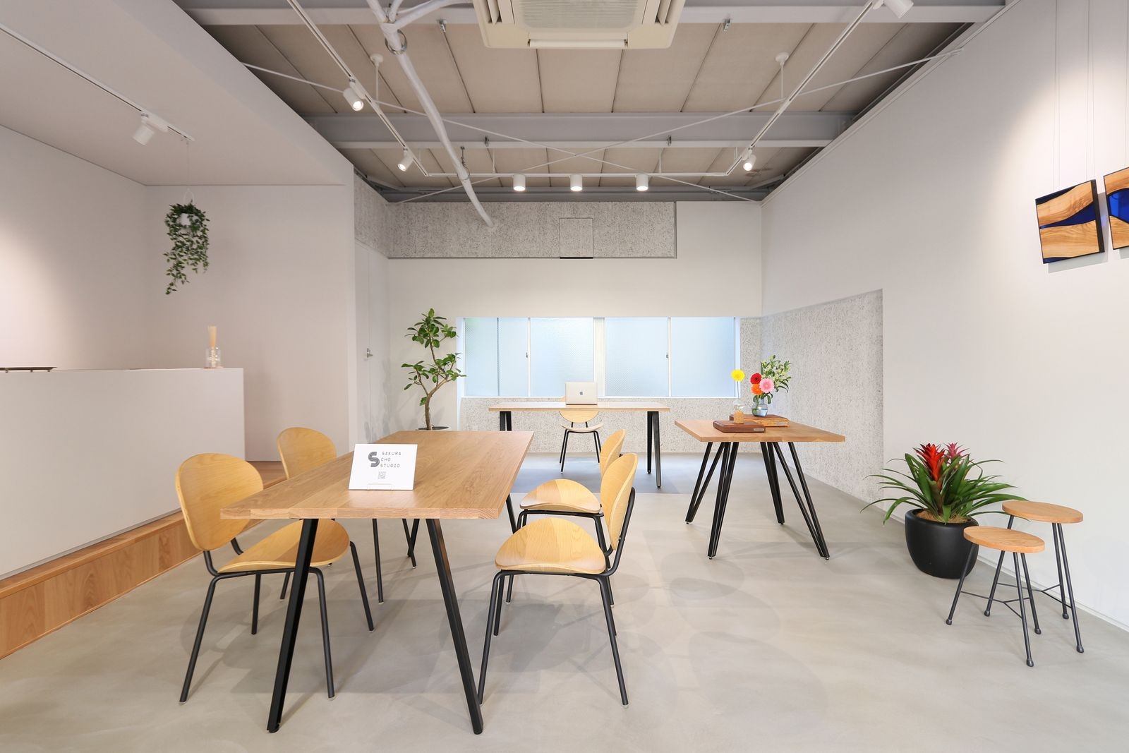 子育て支援に力を入れているまち、兵庫県明石市。 JR明石駅から徒歩5分のところにある空き倉庫の1区画をオフィスにリノベーションした計画です。 駅からのアクセス性を活かして、オフィス利用だけではなくギャラリーやフォトスタジオ等にも使えるように設えています。 木製の建具や家具・アートワークを際立たせるために、内装は無機質な仕上げとしています。 小上がりとカウンターまわりの各種寸法は、多様な使い方のきっかけとなるように設定しています。
