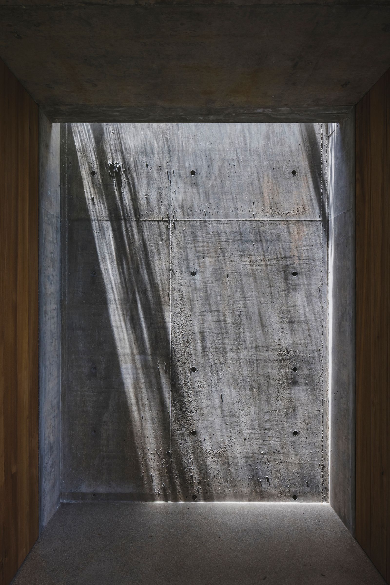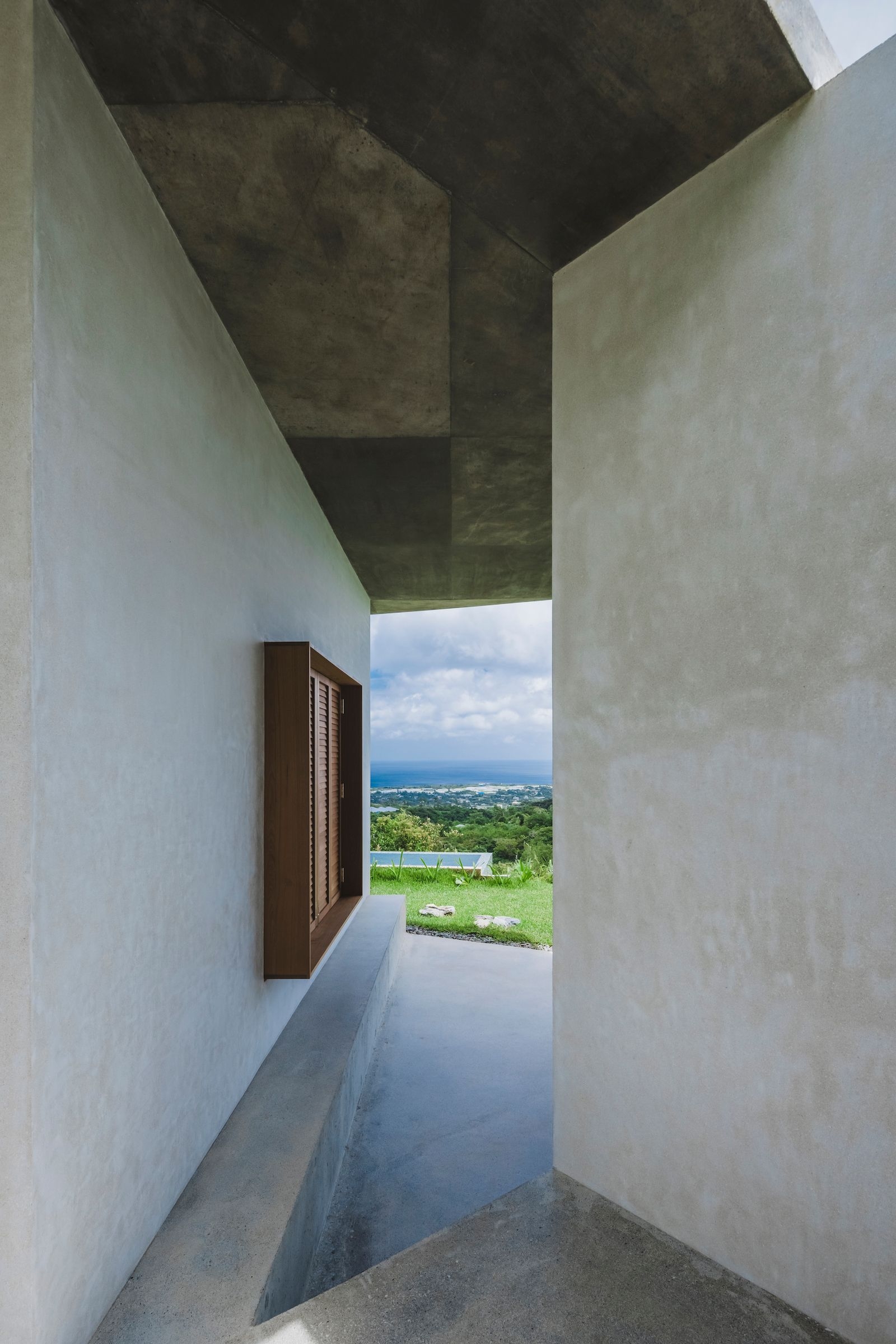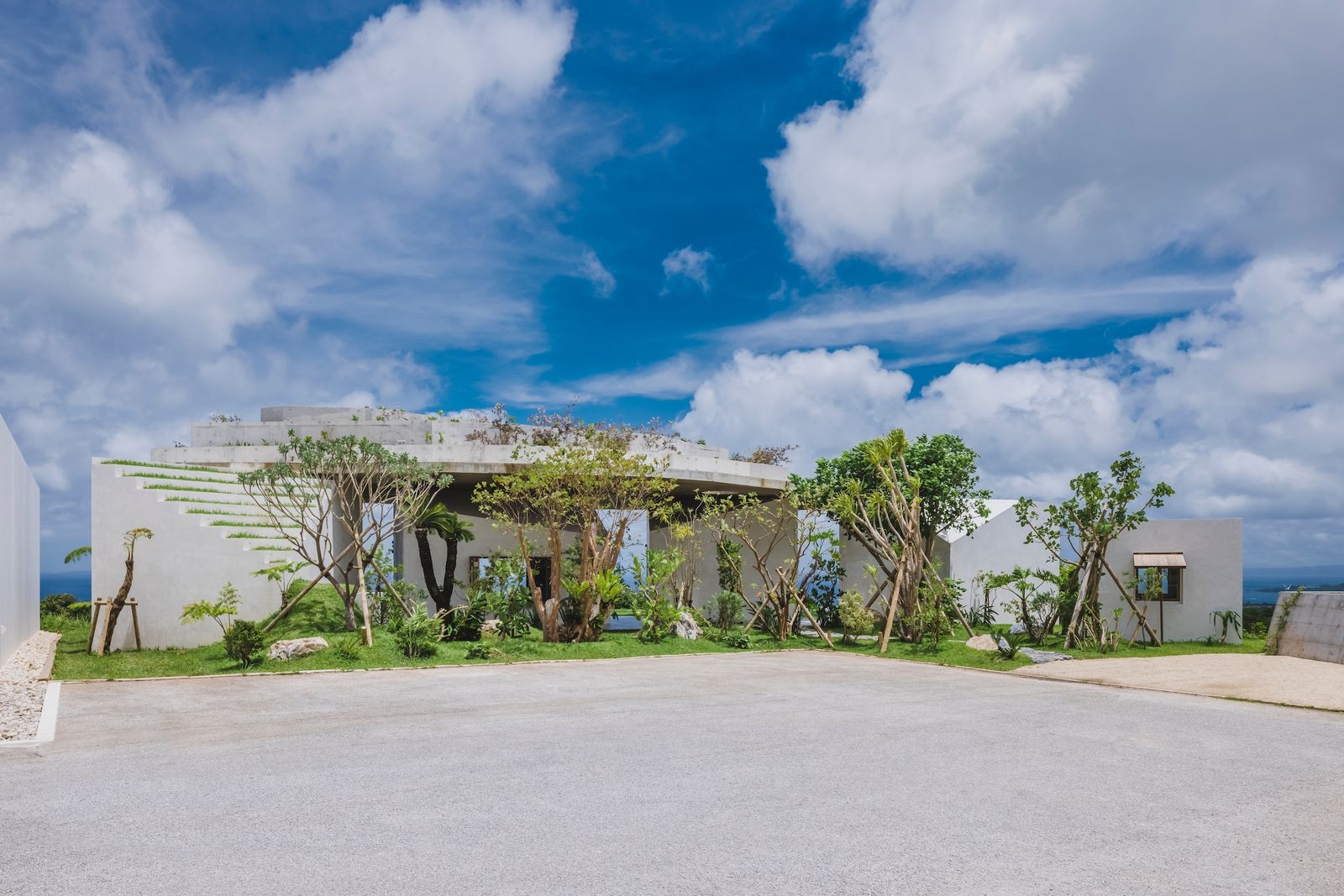 この住宅は沖縄県北部の山の中腹を開発して作られた住宅地の端にあり、北側に海を眺望する自然に囲まれた場所に建っている。 敷地は高台にあるため一年を通して風が良く通り、影のある所であれば真夏でも快適に過ごす事ができる。建主も風が抜ける影の空間の居心地の良さを知っており、自然の中での開放的な暮らしができる住宅を望まれ、特に昼夜を問わず外で過ごすことが好きなので快適な半屋外の空間をつくって欲しいことや、将来は海外との2拠点の生活を想定しているため1年の半分程度はホテルとして運営していきたいと要望された。 建物は緑化された大きな屋根の下の開放的な広間と屋根を支える最小限の室内化された個室からなり、半屋外の広間は深い影に覆われ一年を通して沖縄の豊かな自然を実感させてくれる。 個室は居間や食堂、浴室などの機能に別れているが各々が広間へと機能が拡張され広間を介し内と外、個室同士の生活の行為が繋がっていく。諸室の機能によって区切られることのない内外を通して連続した生活環境が営まれる事で、豊かな自然を享受する現代の沖縄の住宅になるのではないかと考えた。