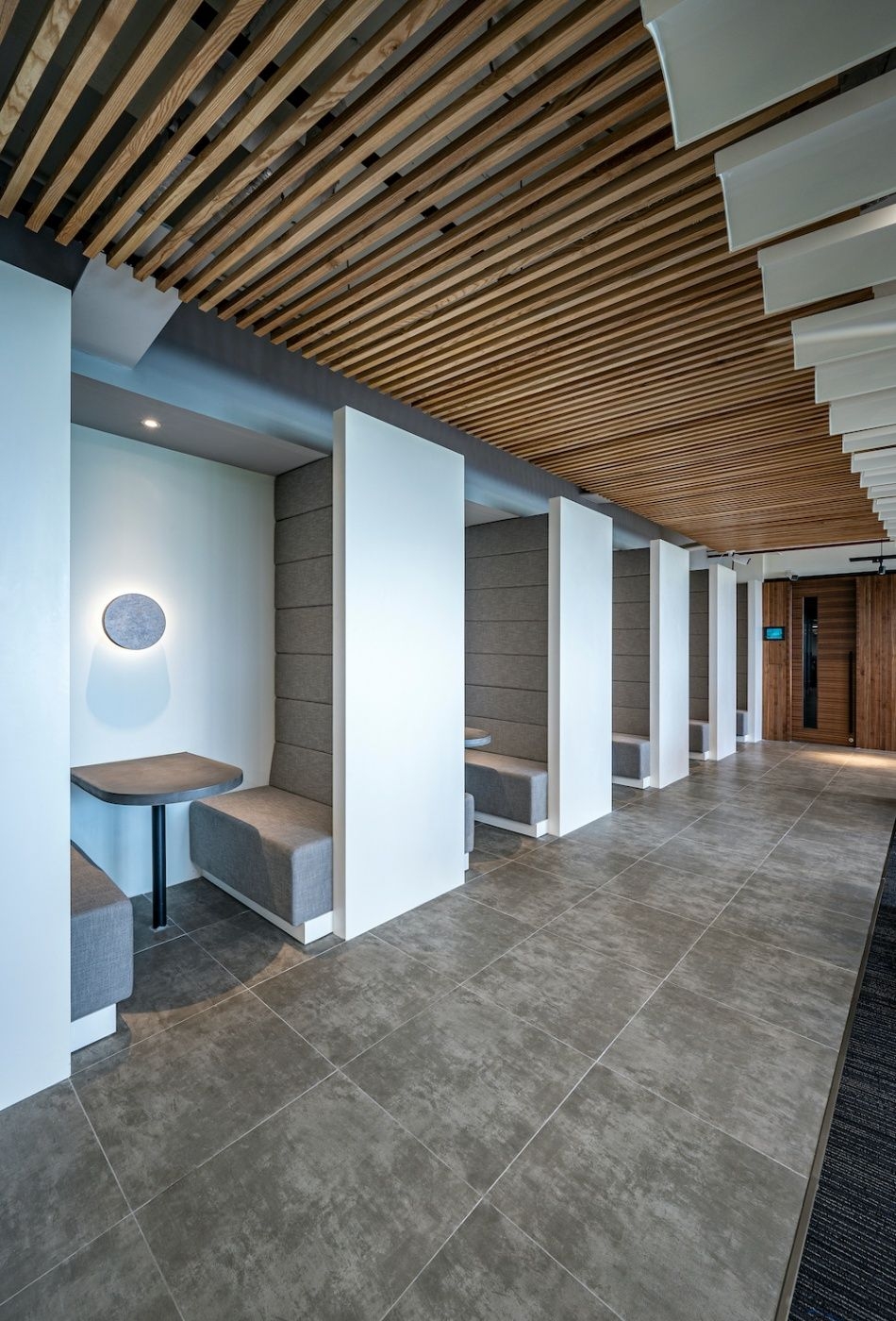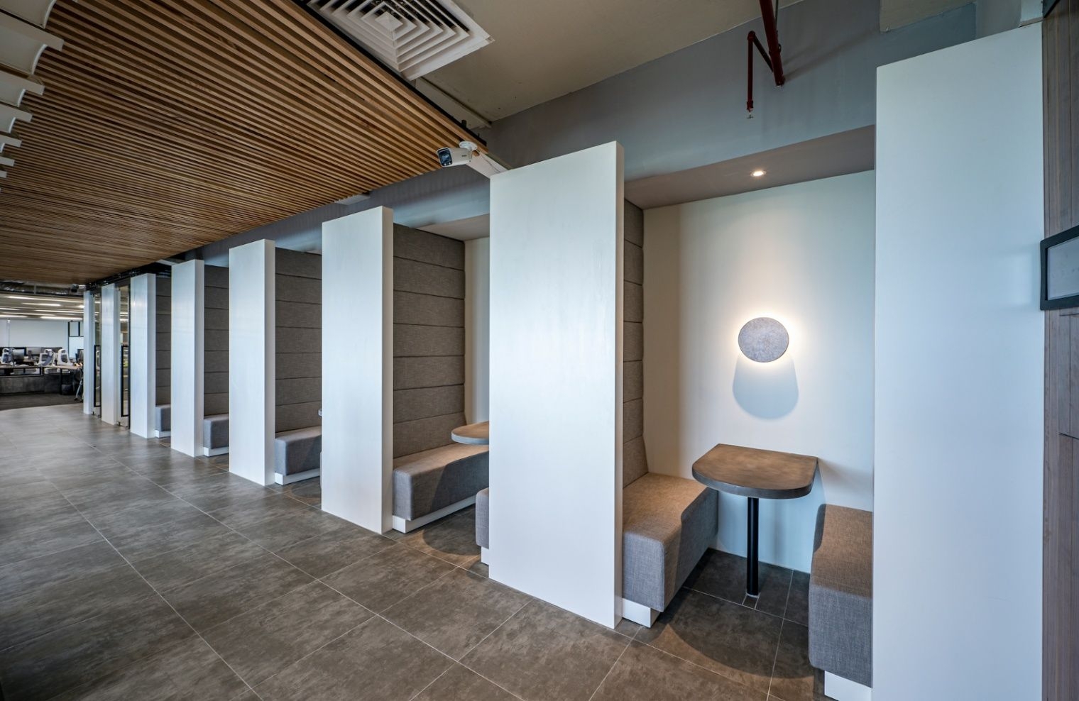 NAB STUDIOはモバイルアプリ開発業務を中心とした、ベトナムの先駆的なIT企業である。 今回、事業拡大に伴う人員増加により、オフィス拡張と働く場の環境改善を目指し、より快適なオフィス空間の計画をすることとなった。 様々なプロジェクトをかかえる同社では、プロジェクトごとにチームを作りメンバー同士での活発なコミュニケーションが不可欠である。ときには一人で集中して作業できるようなスペースも必要である。 以前のオフィスに不足していたこのような要求に応えられる空間を実現し、機能的で生産性がアップできるオフィスを目指した。 入居するオフィスビルはホーチミン市7区の開発されたエリアにあり、室内からは緑に囲まれた大きな人工池の眺望が得られる抜群のロケーションにあった。 レイアウトは執務スペースを全体の中央にまとめ、それを囲むようにして周りにMTGルーム、バックオフィス、ラウンジなどを配している。またビル共有部を挟んでCANTEENがある。 オフィスの広さは以前の2倍になったが、天井高は以前が4000mmであったのに対し今回は高さ2450mmと体感的にもかなり低くなり、クライアントからも低さを極力感じないような工夫を求められた。 天井パネルを撤去して高さを確保することも検討したが、配管や空調ダクトが乱雑に設置され、天井露出仕上げとするのは難しい状態であった。 解決策として浮かんだのが、波型の天井であった。 単調でフラットだった天井に曲線の連続でリズムを生み、凹凸で立体感を与え、天井の低さを感じさせないよう工夫した。 一つの波型のパネルは幅300mmで、執務スペースの上部に400mmピッチで設置した。パネル間の100mmの隙間には照明や空調の吹き出し口を配置している。スチール製のパネルは、ツヤありの塗装をすることで外光を適度に反射させ室内を明るくすることにも寄与している。 チーム内のコミュニケーションがとくに重要なデザイン・開発部は、向かい合う2人1組のデスクをずらしながら配置することにより、隣同士になるものが斜めに向き合うこととなり、互いの距離感が近くなるよう工夫した。 オープンスペースは広く取られ、 休憩だけでなく個人作業、チームミーティング、イベントなど働き方に合わせて多目的に利用できるようにしている。