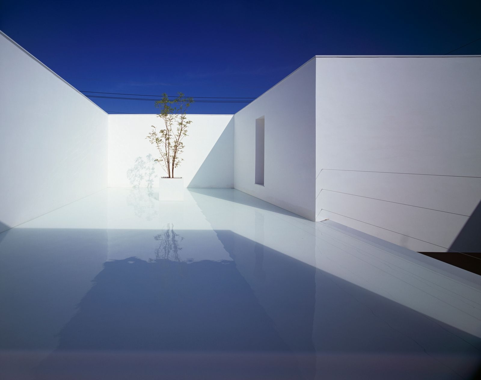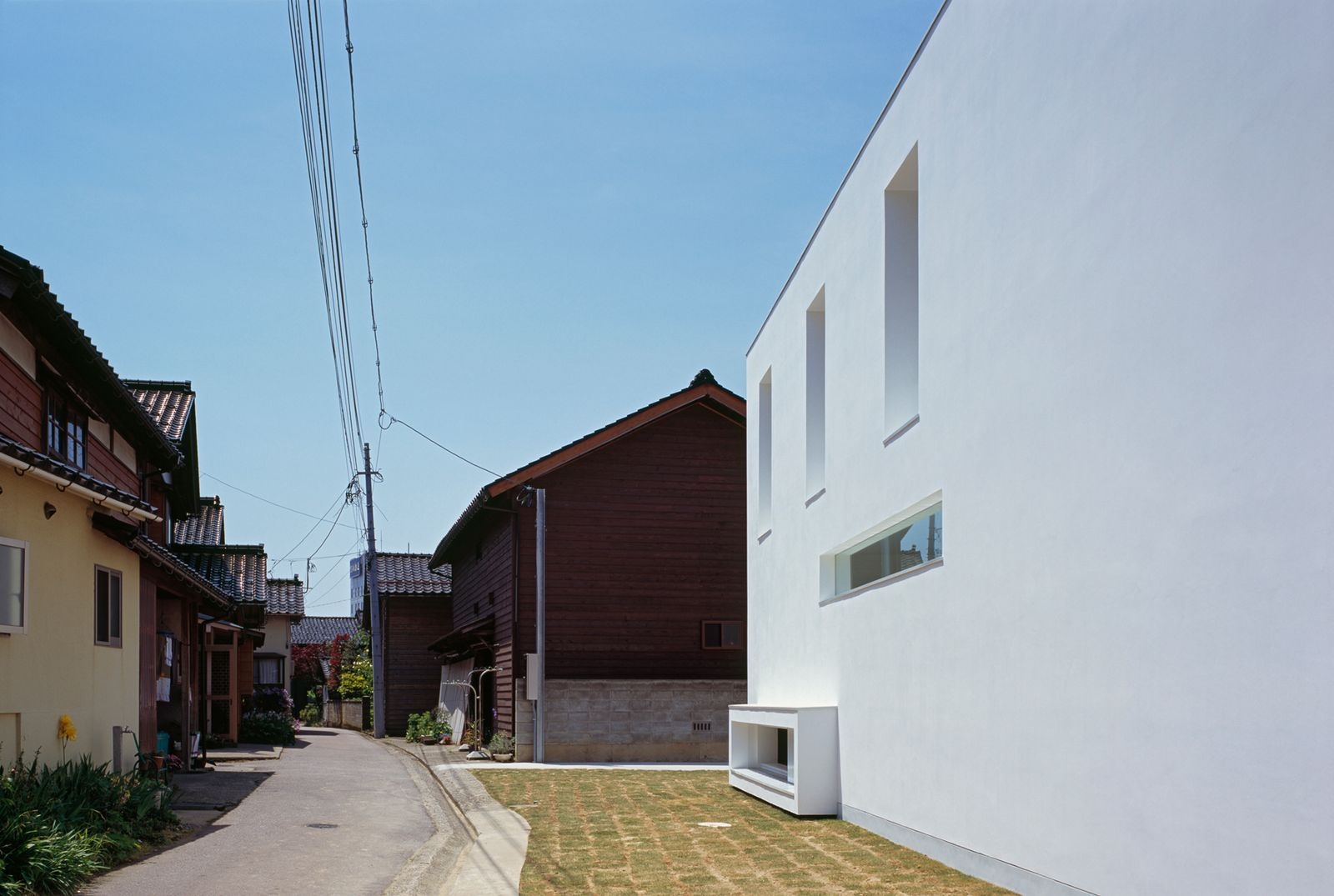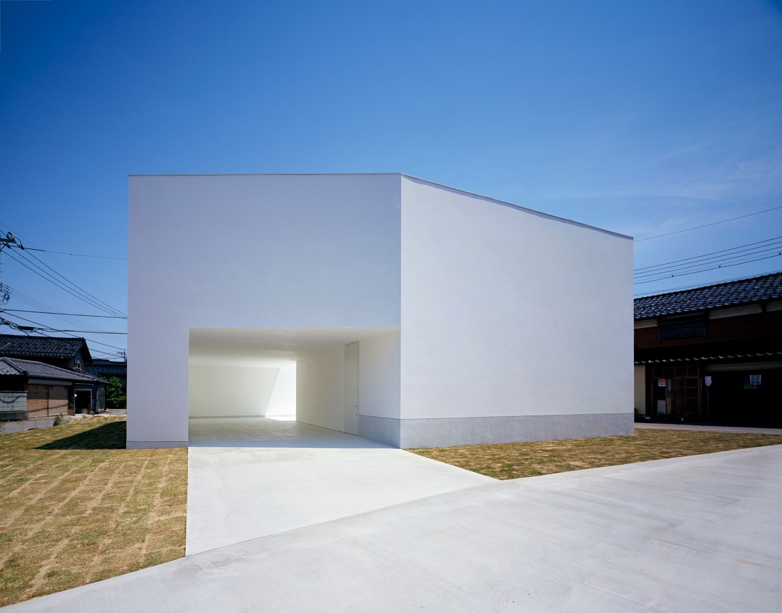 白く厚みのある外観が特徴的な、金沢市郊外の敷地に建つ中庭式住宅です。 建主のご希望はミニマルで真っ白な意匠と多数の屋外空間、すなわち屋根付き玄関ポーチ、自家用車2台分の屋根付きガレージ、そして中庭を備えた住宅を、というものでした。確かに屋根付きの玄関ポーチやガレージは雪の多い金沢において不可欠なものですが、決められた予算の中でこれらを全て確保した場合、生活するための内部空間が圧迫されることになりかねません。また中庭は雪によって容易に埋没してしまうことが予想されており、降雪地帯の生活に適合させるためには何らかの工夫が必要になります。 これらの問題を解決するため、提案されたのが屋外空間同士をクランクさせながら互いにつないで行くというアイディアです。一つ一つの屋外空間の大きさは抑制しつつ、隣接する屋外空間同士をつなぐことでお互いの機能を補完させ、次につながる空間からは太陽光が差し込むことで奥行きの深さが暗示されて各空間が狭苦しく感じられない、そのような構成が模索されました。 この方針の下ではガレージなどの空間を中庭のようなプライバシーが求められる空間と接続する必要があるため、各屋外空間を立体的にクランクさせることで視線を遮断し、外から内部を見通すことが出来ないようにしています。我々はこの一連の屋外空間を「白い洞窟」と名付け、これを取り巻くように居室空間を配置することで、中庭式住宅特有の静謐な空間に生じる光の変化を生活に取り込んで頂くことにしました。同時に、これら屋外空間のつながりは中庭やテラスに積もった雪を除去するための搬出経路としての役割も持っており、「白い洞窟」は中庭式住宅を降雪地帯で成立させるための実用的な仕組みともなっています。 こうして生じた一連の屋外空間は外界から隔絶されたミニマルな美しさを持っており、これをさらに際立たせるため、中庭の防水層に工夫を加え、浅く水を張って水盤とすることが出来るようにしました。陽光が差し込む白い壁と空の景観に水が導入されたことで光の反射とゆらぎがもたらされ、ミニマルな美意識に囲まれた生活に柔らかな表情の変化が加えられています。