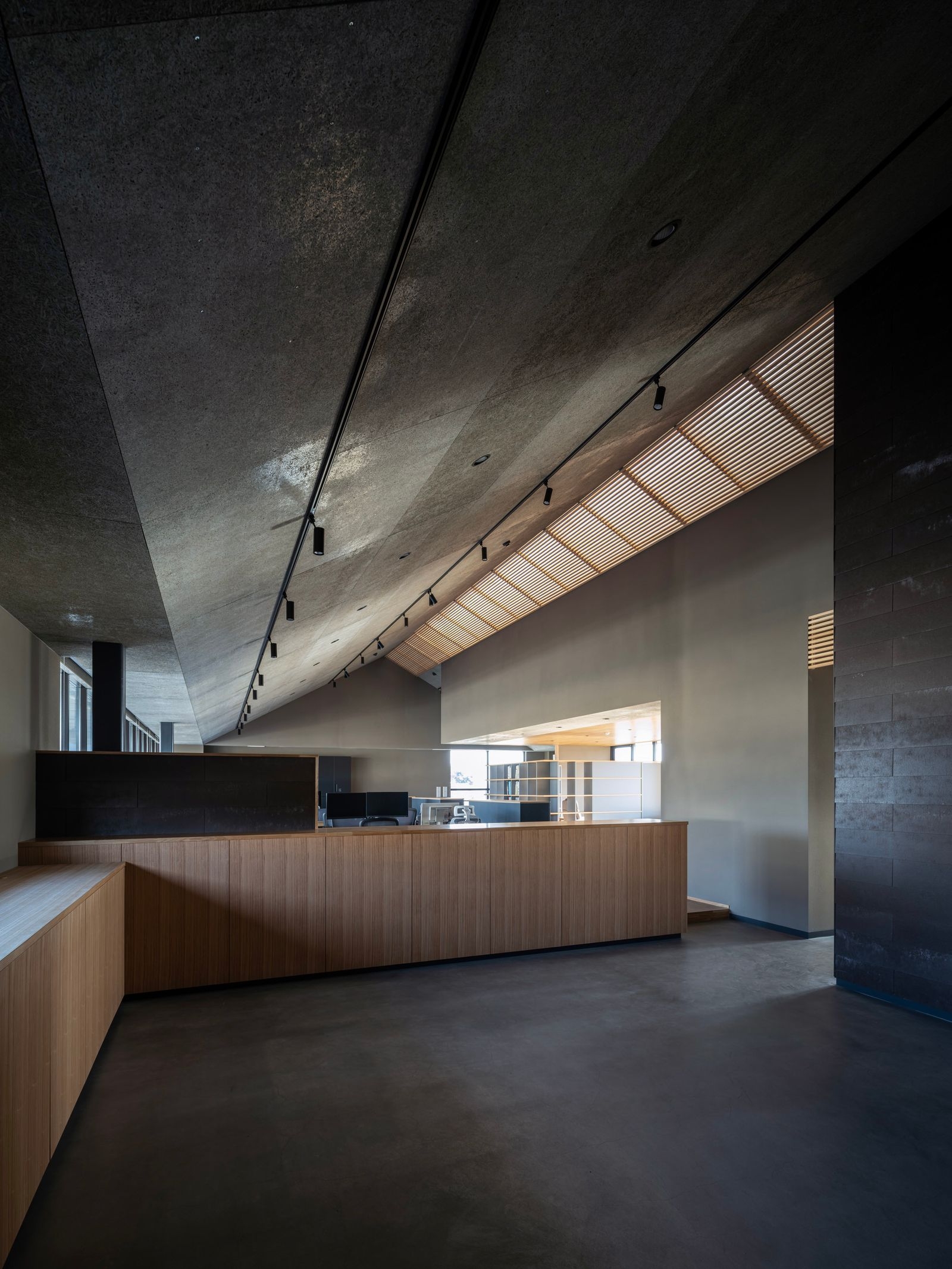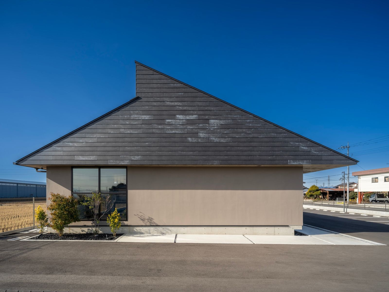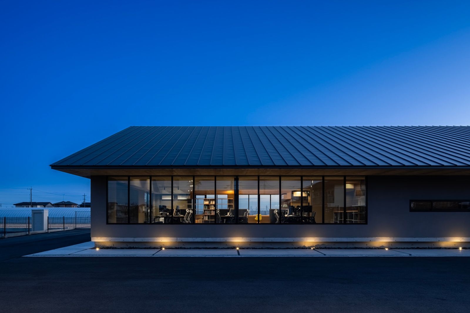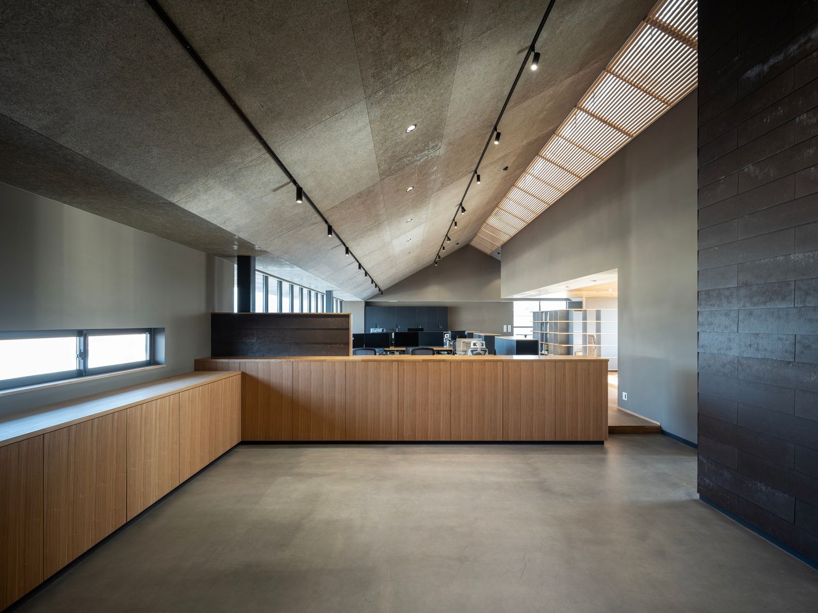 栃木市の市街地と田園地帯の境界に建つ、社員数約15名のガス供給会社の新社屋である。建物は全体の約3分の2を店舗・オフィス、残りを住宅とする用途構成とした。 人材確保が難しい業界背景の中、施主からは「オフィスらしくなく、働きたいと思える社屋」という要望があった。これを「居心地の良さと、仕事に向かう適度な緊張感が共存する空間」と解釈し、外観は周辺環境を読み取った簡素で間口の広い形態とし、内部は自然素材を用いながら空間にメリハリを持たせる計画とした。 建物は前面道路からの圧迫感を抑えるため平屋建てとし、周辺の田園風景に点在する素朴な建築(牛舎や豚舎、農業用施設)を参照した切妻屋根のプロポーションとしている。北側のエントランスファサードは、基礎を片持ちとし、構造的・経済的合理性の範囲で建物を地面から浮かせることで、軽やかな印象を与えた。 内部空間には、一般的なオフィスではあまり採用されない勾配天井を積極的に取り入れ、美術館や店舗のような開放感のある空間を目指した。勾配天井の頂部にはハイサイドライトを設け、木製ルーバーを介することで直射日光を和らげながら、柔らかな自然光が室内全体に行き渡るよう調整している。 勾配は5.5寸とし、「蔵の街」として知られる栃木市に多く残る蔵の屋根勾配を調査した結果を反映させた。施主、社員、設計者がいずれも地元出身であることから、地域性を空間に静かに織り込むことを意図している。南側の休憩コーナーからは、季節によって田園に広がる稲穂を望むことができ、自然や地域の風景を身近に感じられる場としている。 内装仕上げには、クリーンエネルギーを扱う施主の理念を反映し、再生材である硬質木毛セメント板、使用済みコーヒー豆を原料としたセメント板(SOLIDO)、天然木を組み合わせて使用した。特に天井に用いた硬質木毛セメント板は、耐火性・断熱性・調湿性・吸音性に優れ、オフィスに求められる機能を自然素材によって満たしている。 働き方については、当初希望のあった全面フリーアドレスを見直し、業務内容のヒアリングを踏まえて、基本は固定席としつつ一部にフリーアドレス的なスペースを設けた。業務効率と柔軟性を両立させるとともに、オフィスでは珍しい靴を脱ぐスタイルを採用し、リラックスして仕事に向き合える環境としている。 断熱性能は省エネ基準を上回る水準を確保し、高断熱住宅並みの性能とした。空調には住宅用壁掛けエアコンとガスファンヒーターを採用し、施主が自社で維持管理できるよう、配管経路や点検性を設計初期から考慮している。床下には45cm以上の懐を確保し、将来的な間取り変更や設備更新にも柔軟に対応可能な計画とした。 屋根には太陽光発電パネルを設置し、浸水を考慮して室内に蓄電池を配置することで、平常時の省エネルギー化に加え、災害時にも照明や空調が使用できる自立性を確保している。また、非常時に接続可能なガス配管を外部に設け、地域インフラを担う企業としての社会的持続性にも配慮した。 照明はダウンライトからダクトレール方式へ変更し、運用の自由度を高めた。JISで求められる照度を確保しつつ、豊富な自然光により、実際の運用では手元灯以外の照明使用を最小限に抑えている。 構造は、施主が過去に水害を経験していることから鉄骨造を採用し、各スパンを同一架構とするシンプルな構成とした。床レベルを外構仕上げより高く設定することで、水害時にも迅速にガス供給業務へ移行できる計画としている。 本計画は、地域性に根差した形態計画、パッシブデザインによる省エネルギー、再生材の活用、設備更新性への配慮、災害対応といった多角的な視点からサスティナブルな設計を行ったものである。結果として、コスト・働き方・将来更新性のバランスが取れた地方中小規模オフィスの一つのモデルを目指した。 完成後には新規採用にも良い効果をもたらしているようで募集人数がすぐに採用できた様である。